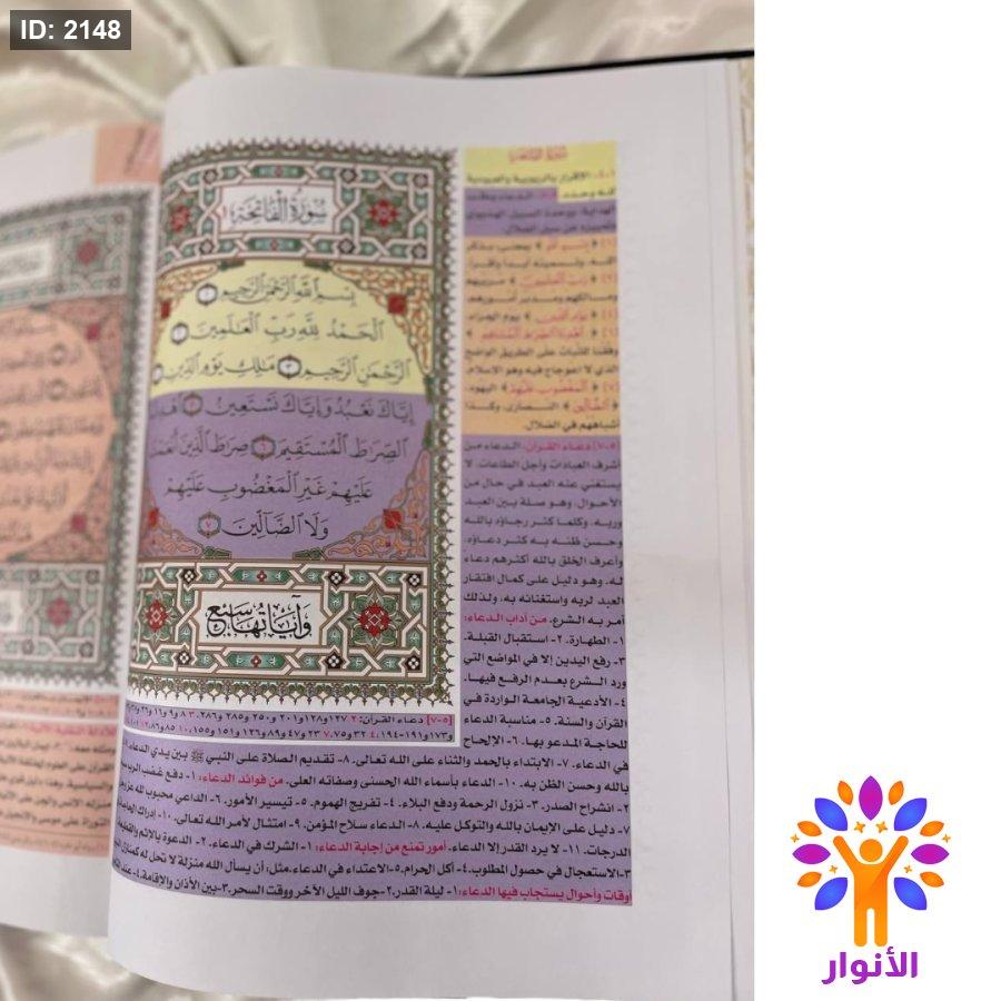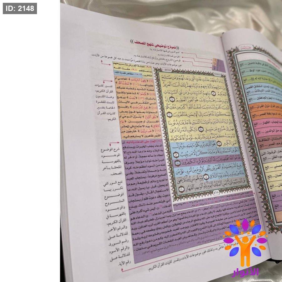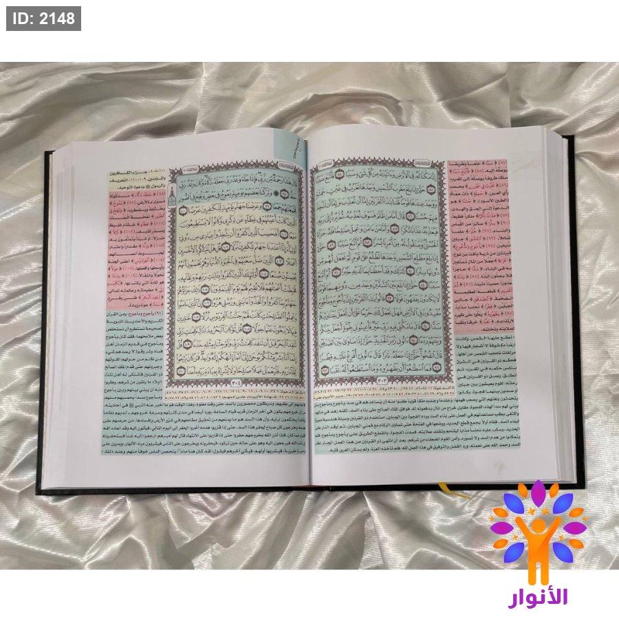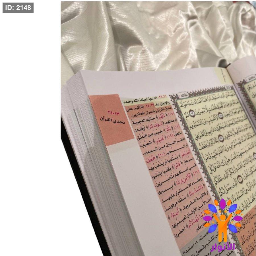 - مثلا اذا اردت البحث عن اي قصة من قصص القران فانظر الى اللون الخاص بقصص القران وهو اللون الاخضر ، وهكذا طريقة البحث في باقي الموضوعات من خلال الفهرسة الموجودة في اخر المصحف .