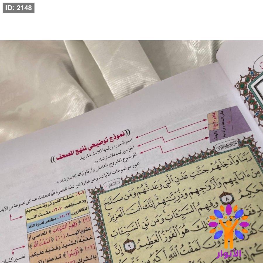 ٦- تذييل هامش المصحف بنبذة مختصرة عن محور موضوعات كلّ مجموعة من الايات ، كما تذيل هامش المصحف ايضاً بتفشير كلمات القران الكريم.